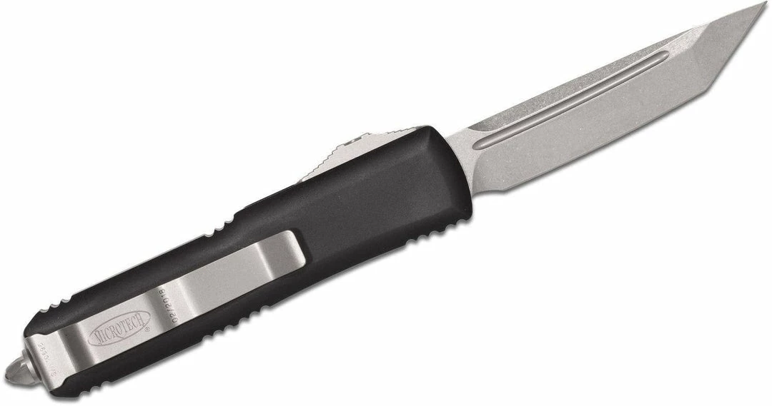 All Knife Brands Microtech UTX-85 233-10 Auto OTF 3″ Stonewashed Tanto Plain Blade, Black Handles