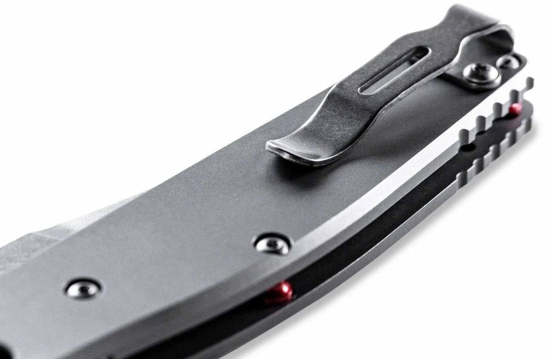 The Warren Osborne designed Benchmade 940 is a popular knife for good reason. It’s a comfortable everyday carry knife with its slim design, great ergonomics and lightweight. The 940 has a CPM-S90V steel blade with a plain edge and a satin finish. The 6AL-4V titanium aluminum handle has 410 stainless steel liners and a red aluminum spacer on the handle back with custom ridges. The AXIS lock and reversible pocket clip make the knife usable for right and left handers.