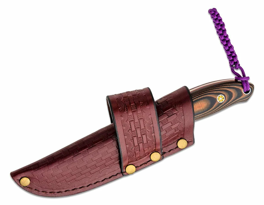 The Hunt’N Fisch is a small hunting knife with special features that make it a go-to fixed blade for many outdoorsmen. The 2.99″ blade is made from 8Cr13MoV stainless steel with a satin finish and flat ground drop point shape. Designer Larry Fischer knows the importance of a good grip, especially on a skinning knife, so he put multiple runs of jimping all over this blade to ensure a good grip, even when wet. The handle is 4.26″, made from brown and black layered G10 so this knife can be drenched in blood or caked in mud and then cleaned off with water, without any fear of damaging the design. Comes with a great drop-in leather sheath and purple braided lanyard.