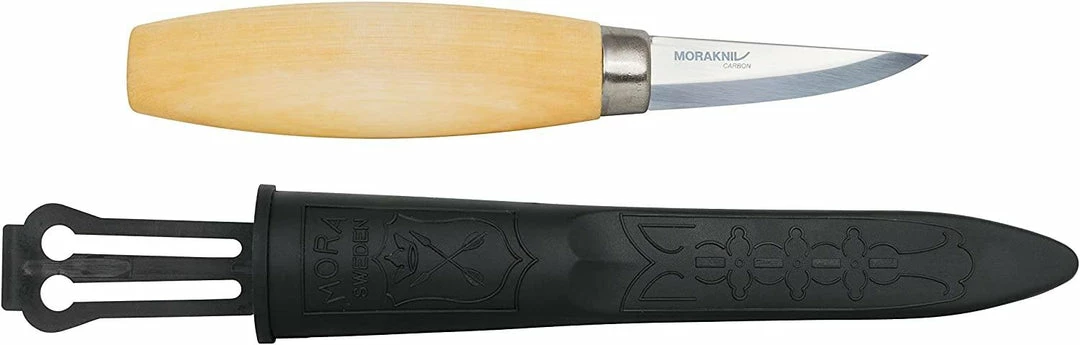 Here is a new version of Mora’s very popular 120 wood carving knife. This is a very faithful representation of a traditional Scandinavian carving knife, with a medium-length, narrow blade paired with a large handle for maximum grip and control. The blade is 100% carbon steel, hardened to Rockwell 58-59, which makes it less likely to chip and a little easier to sharpen than Mora’s original laminated blade. Comes with a plastic sheath.