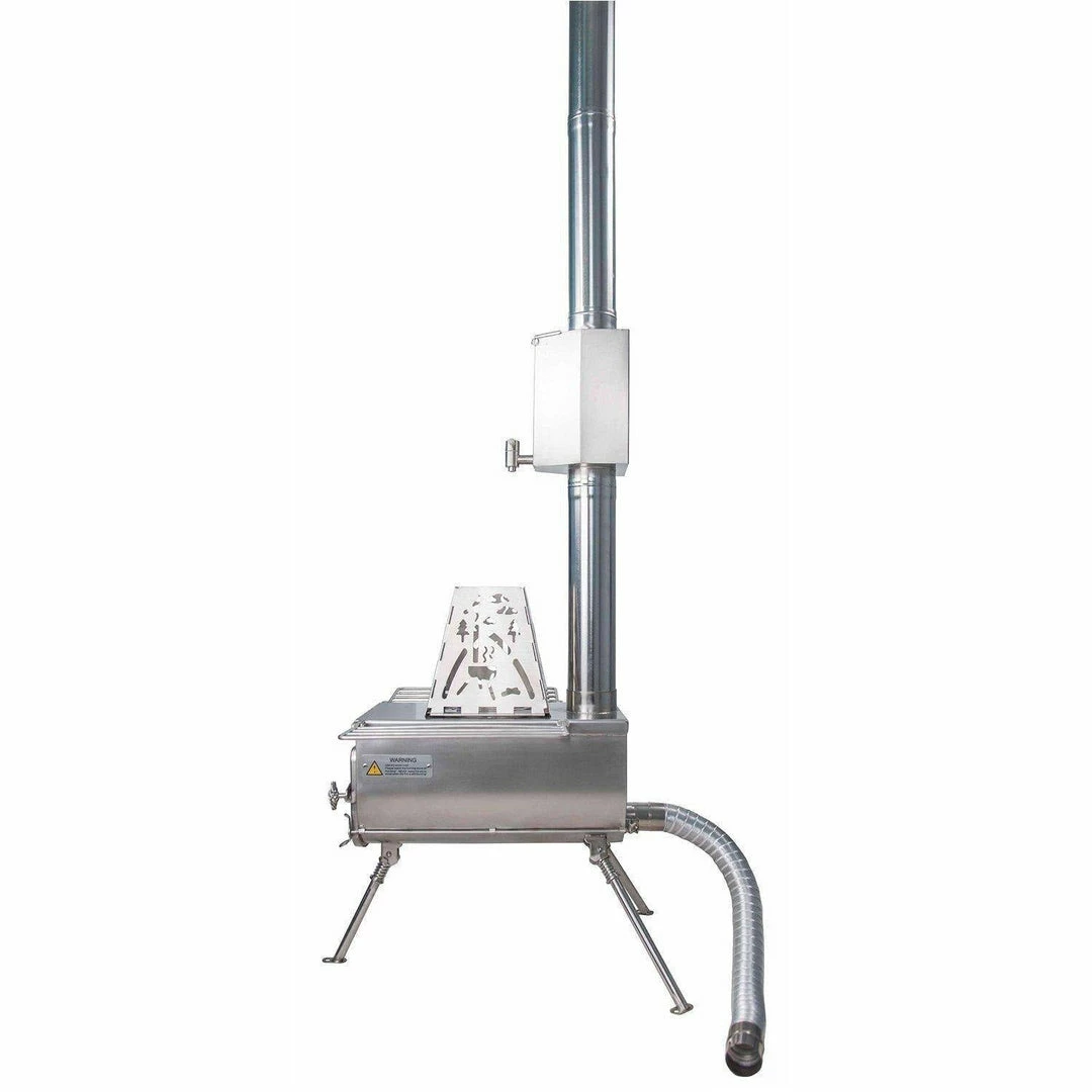 - Highly portable- spring-loaded legs and shelves fold flat to the stove body; 5 pipe sections, spark arrestor, and an ash scraper stow inside the stove body