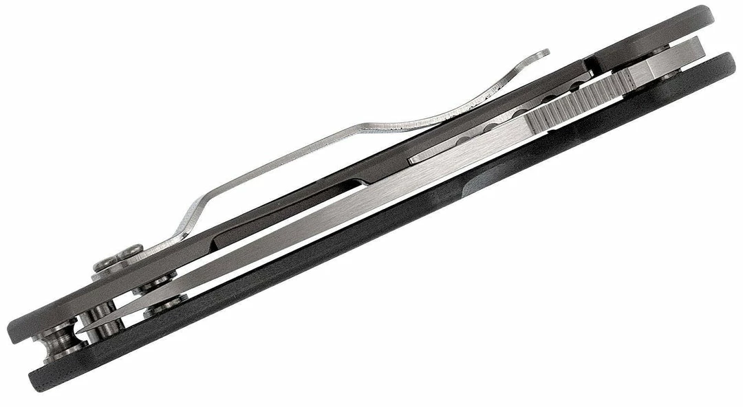 The Brouwer’s slim, ergonomic handle features a matte-finished solid titanium scale and Reeve Integral Lock (R.I.L.) on one side and a textured green G10 scale and nested, skeletonized stainless steel liner on the other. To provide a solid lock-up and long service life, the R.I.L. includes a stainless steel interface that also serves as an overtravel stop to preserve proper spring tension of the lock bar. A reversible stainless steel hourglass clip mounted to the butt end of the handle keeps the knife ready for instant access and offers a choice of left or right-side tip-up carry. It is complemented by a lined lanyard hole that allows the easy attachment of fobs and safety lanyards.