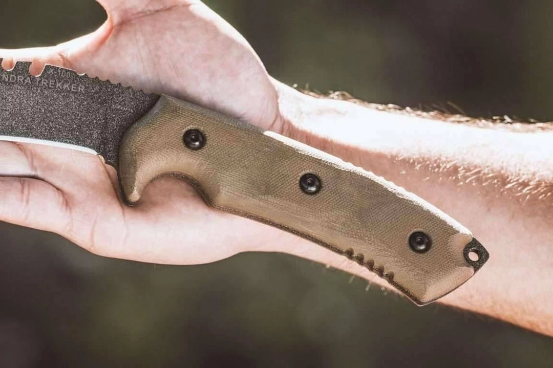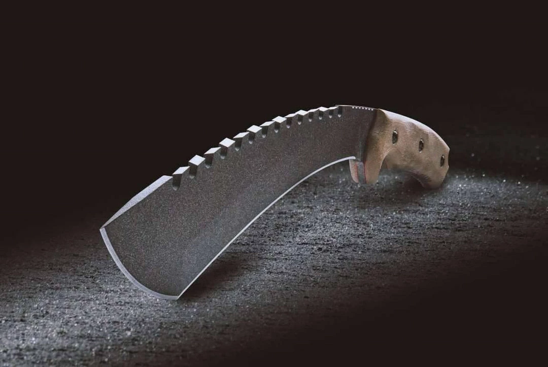 It is thinner and lighter than traditional kukris aside from the obvious fact that the blade style and saw teeth are also not something you’d see on a traditional kukri. Yet this 9″ blade made with a 3/16″ 1095 stock will be an excellent cutter in the field. The nicely rounded Micarta handles are long to provide more than one grip option for different cutting tasks. It has our opposing pitch saw teeth on the top so that users can quickly and cleanly make notches in wood when setting up camp or for certain survival tasks.